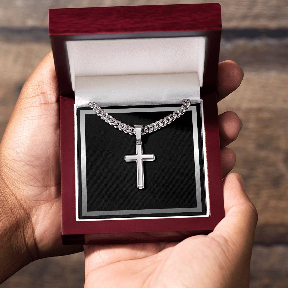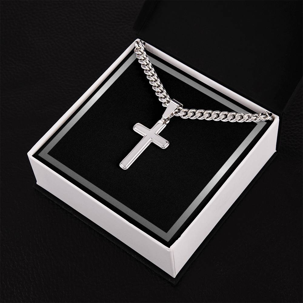 Wear your faith proudly with this Cuban Chain with Artisan Cross Necklace. Perfect for special occasions or everyday wear, this makes a wonderful gift idea for you or your loved one. Personalizing the back of the cross pendant will surely make this gift treasured for years to come!