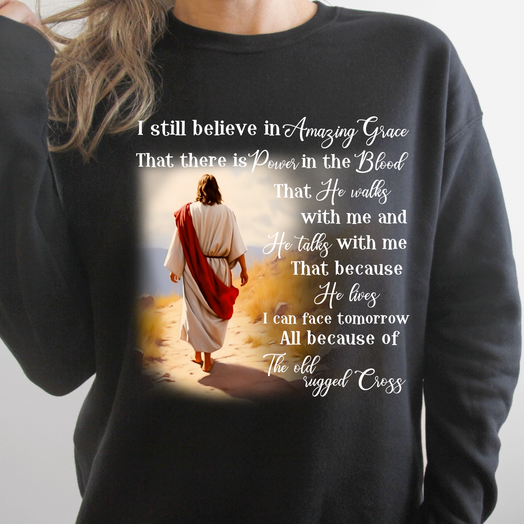 SHIRT READS - I still believe in Amazing Grace That there is power in the Blood That He walks with me and He talks with me That because He lives I can face tomorrow All because of the old rugged Cross.