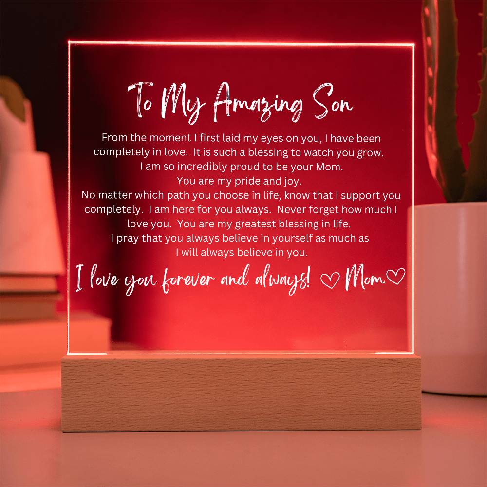 Your plaque will be crafted from premium acrylic with a professionally printed design for a polished look. It comes with a stylish wooden LED base, and you can choose between a USB plug-in option OR a cordless battery-operated option (requires 2 AAA batteries, not included). Both LED bases feature 7 vibrant colors, allowing the user to customize the lighting with various color changes and dynamic cycles.