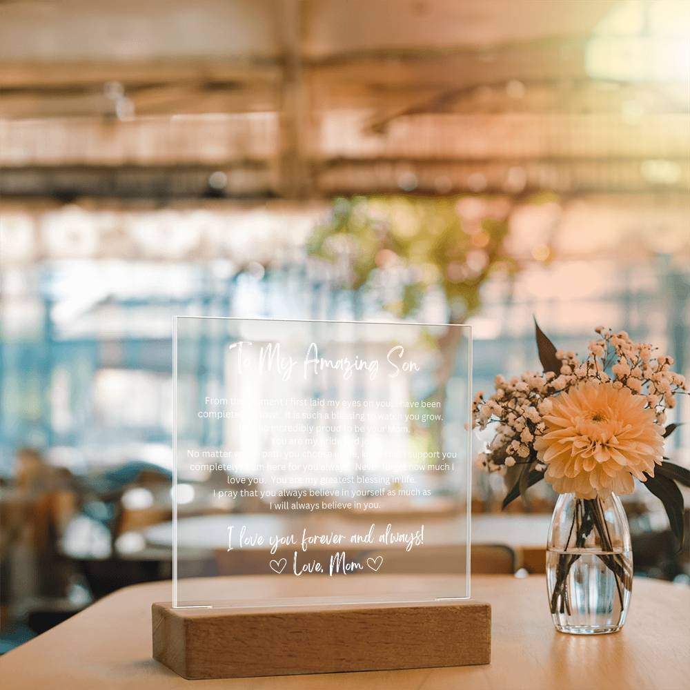 Your plaque will be crafted from premium acrylic with a professionally printed design for a polished look. It comes with a stylish wooden LED base, and you can choose between a USB plug-in option OR a cordless battery-operated option (requires 2 AAA batteries, not included). Both LED bases feature 7 vibrant colors, allowing the user to customize the lighting with various color changes and dynamic cycles.