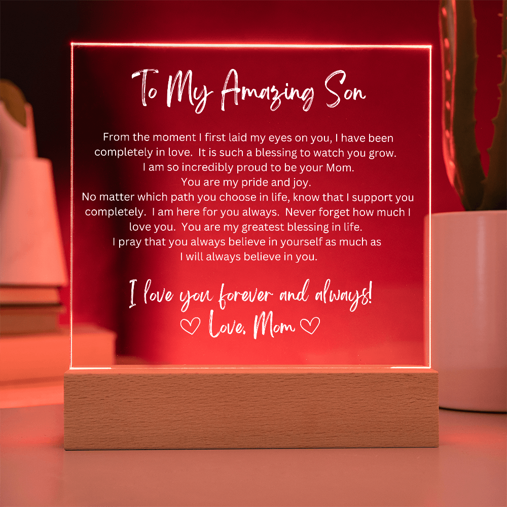 Your plaque will be crafted from premium acrylic with a professionally printed design for a polished look. It comes with a stylish wooden LED base, and you can choose between a USB plug-in option OR a cordless battery-operated option (requires 2 AAA batteries, not included). Both LED bases feature 7 vibrant colors, allowing the user to customize the lighting with various color changes and dynamic cycles.